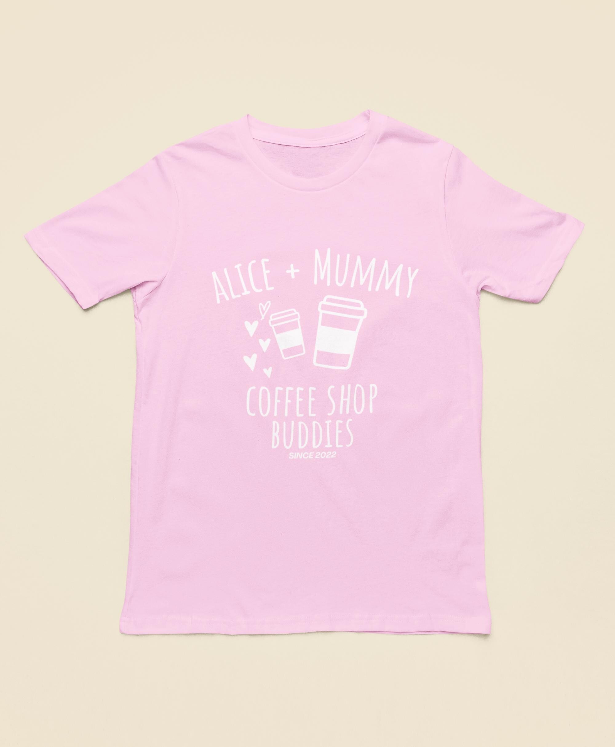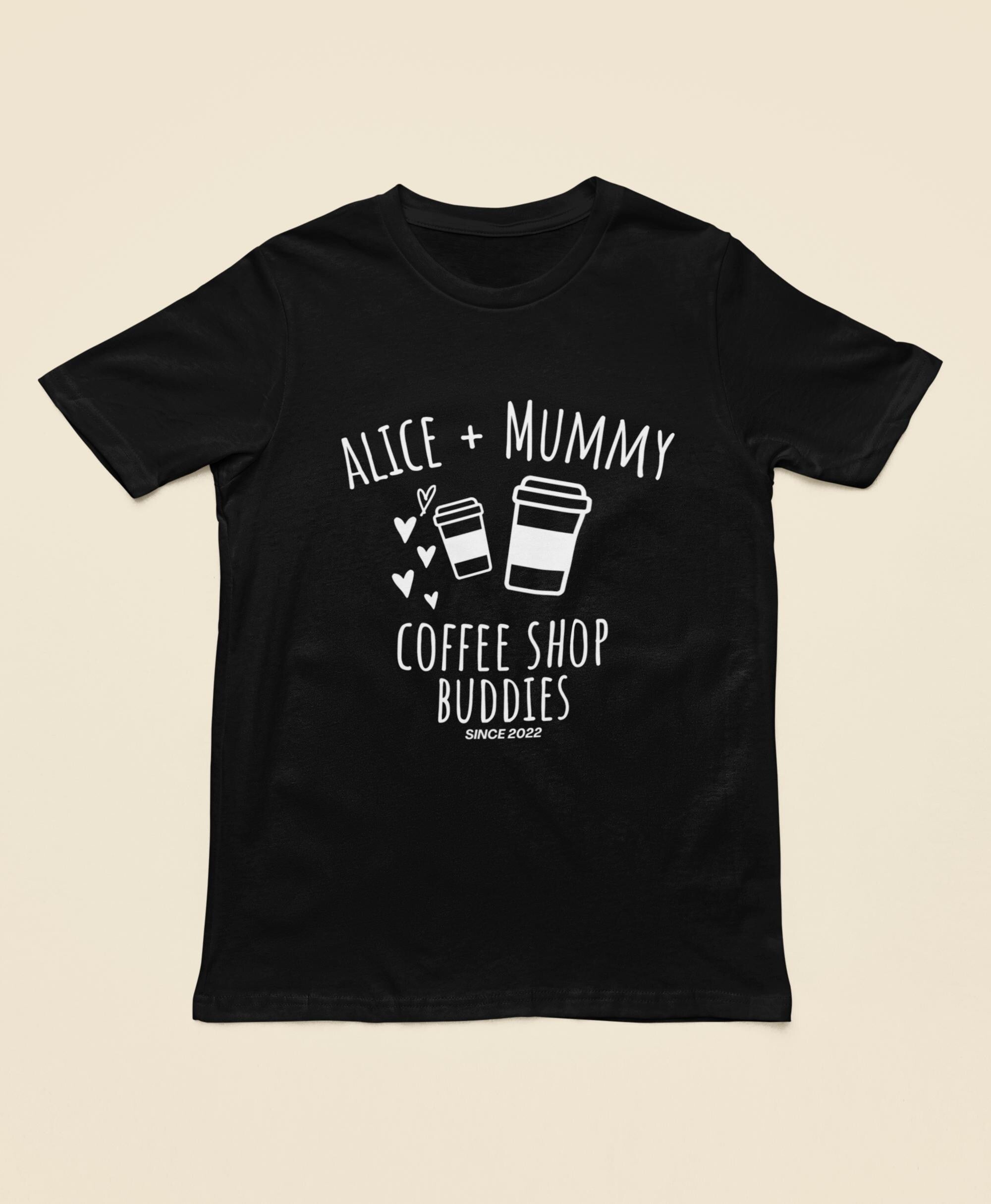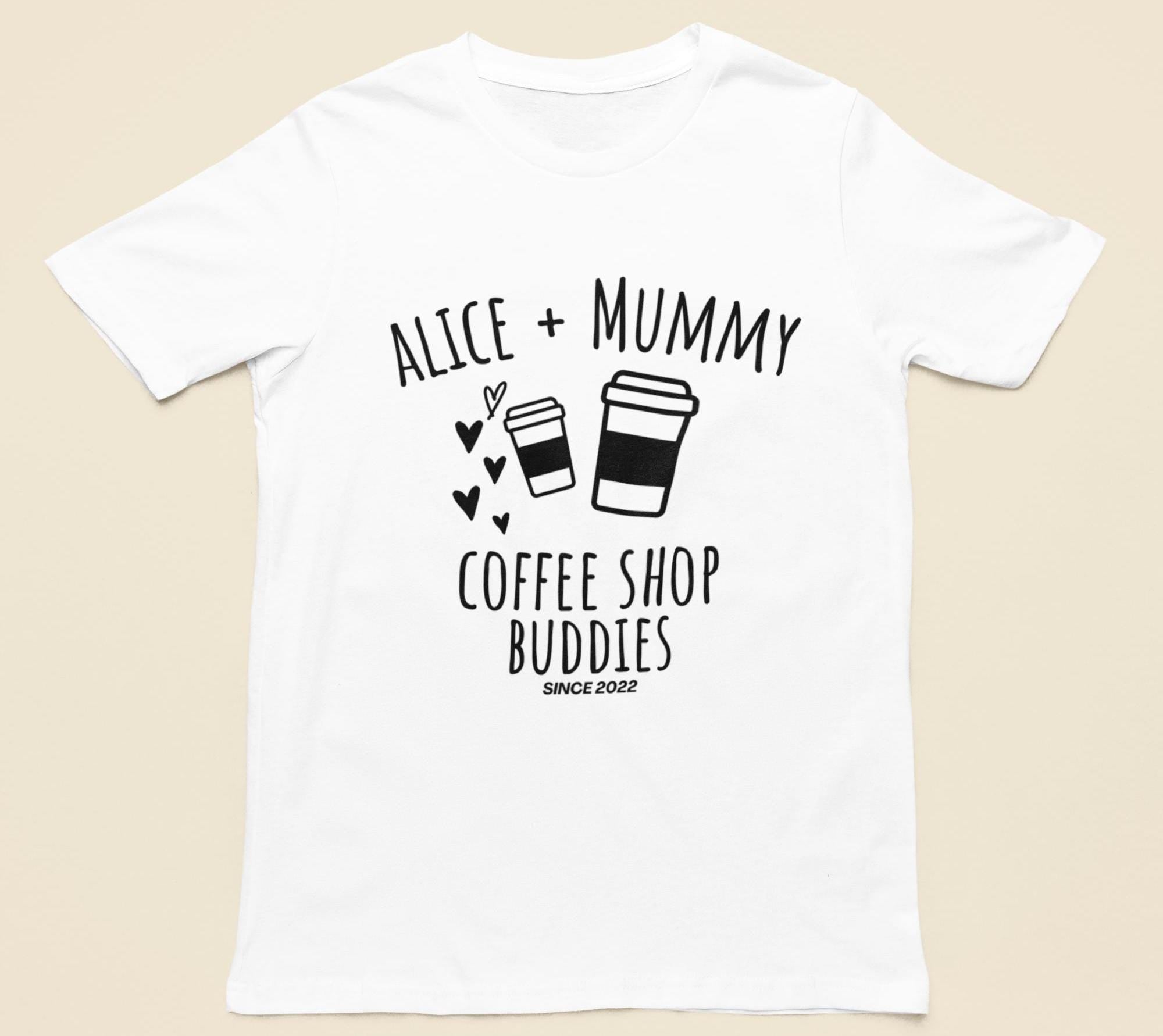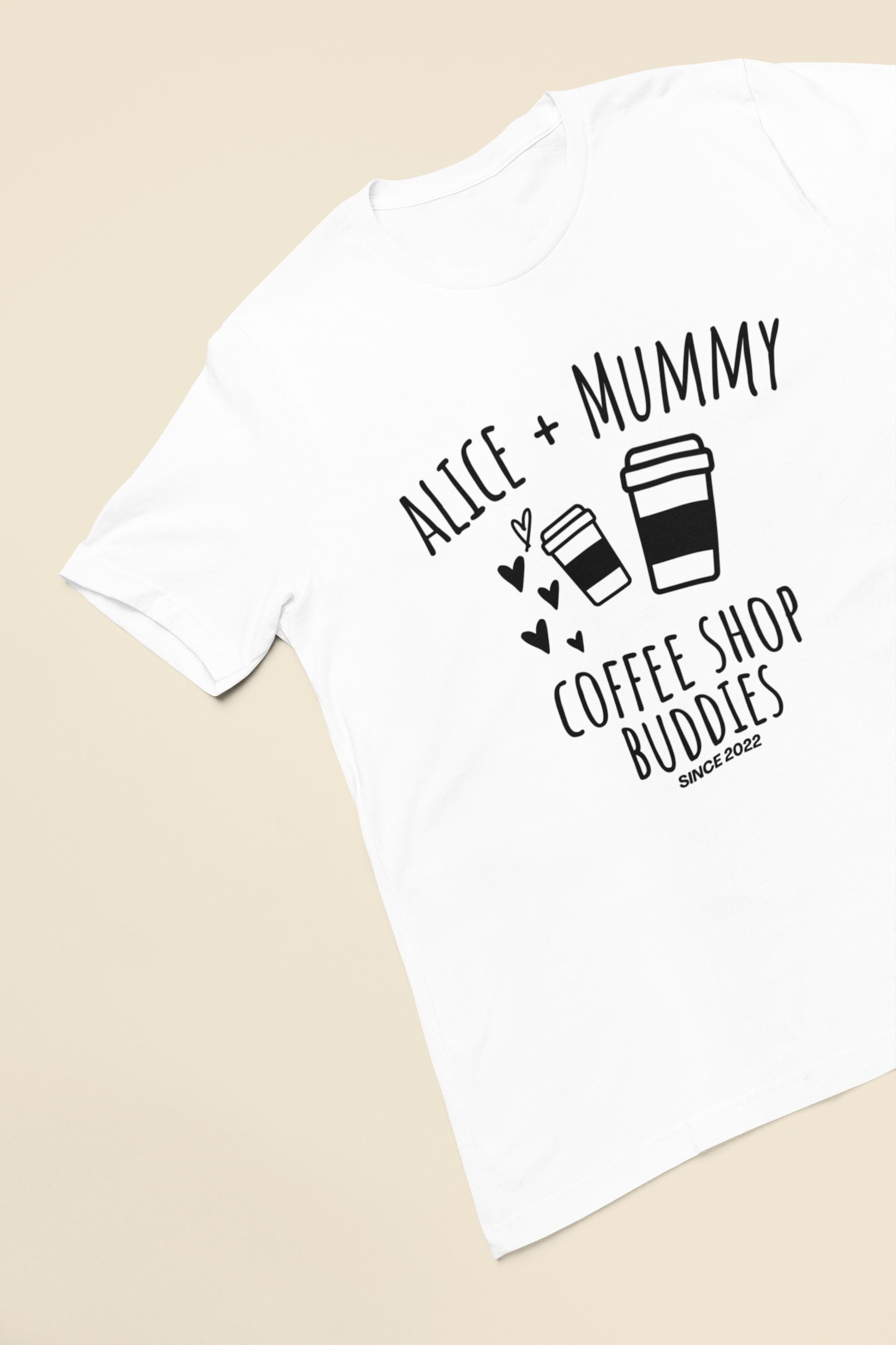 Coffee Shop Buddies Personalised Kids Name and Mummy T-Shirt β Custom Children's Tee for Coffee Dates
