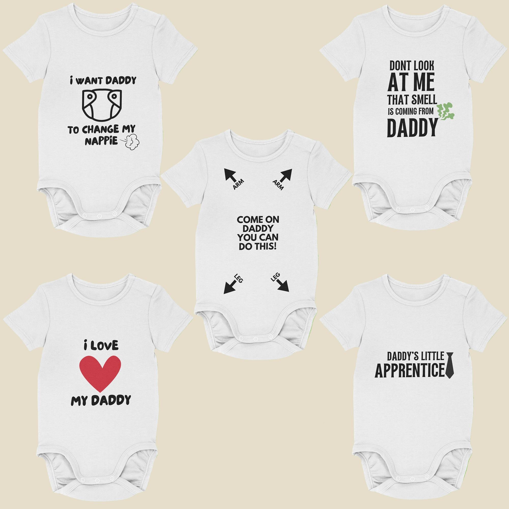 Celebrate the joy of new fatherhood with our delightful Daddy Baby Vest set of 5, designed to make every cuddle and playtime special.This is a set of 5 baby grows This set comes with; I want Daddy to change my nappie Come On Daddy You can do this! Daddys little apprentice I Love My Daddy Dont look at me that smell is coming from daddy! Celebrate the special bond between Daddy and baby with our DaddyVest Bodysuit Set of 5, expertly crafted for a delightful custom baby gift. Each soft, breathable bodysuit not only provides ultimate comfort for your newborn but also captures the heartfelt connection that makes these outfits a unique keepsake—perfect for any loving auntie looking to make a memorable impression. Add this charming set to your cart today and cherish those precious moments!